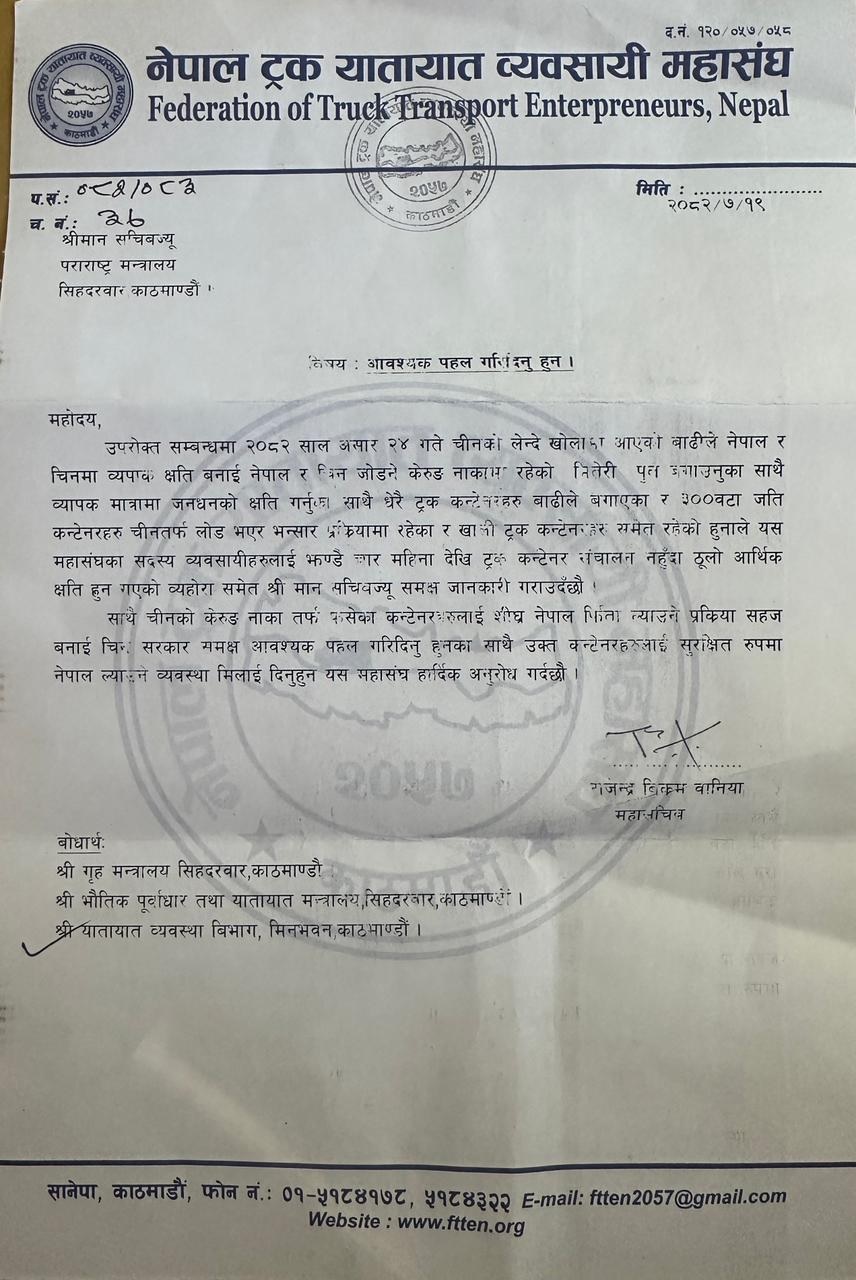 बाढीले जनधनसहित ठूलो संख्यामा ट्रक र कन्टेनरहरूमा क्षति पुयाएपछि नेपाल ट्रक यातायात व्यवसायी महासंघले बुधबार परराष्ट्र मन्त्रालयमा पत्र दिँदै तत्काल आवश्यक पहल गर्न आग्रह गरेको छ ।