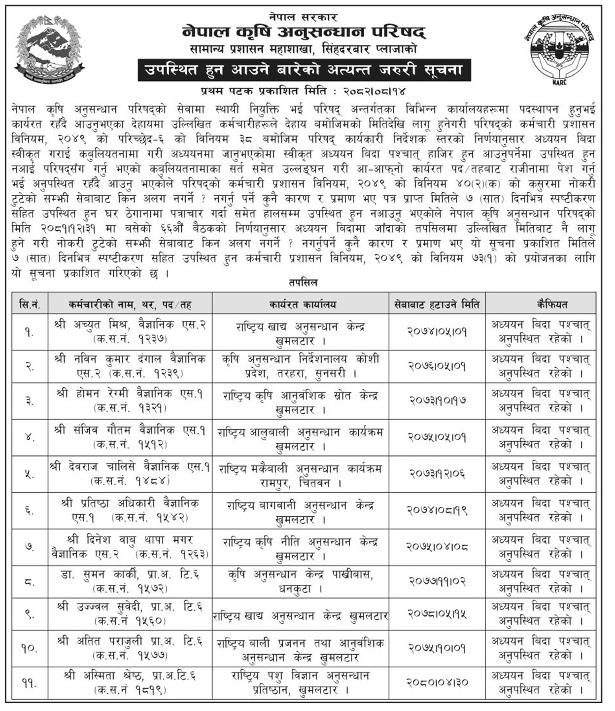 काठमाडौं । नेपाल कृषि अनुसन्धान परिषद (नार्क)का ६ वैज्ञानिकसहित ११ कर्मचारी सम्पर्कविहीन भएका छन् । उनीहरुलाई सेवाबाट हटाउने प्रक्रिया समेत थालिएको छ ।