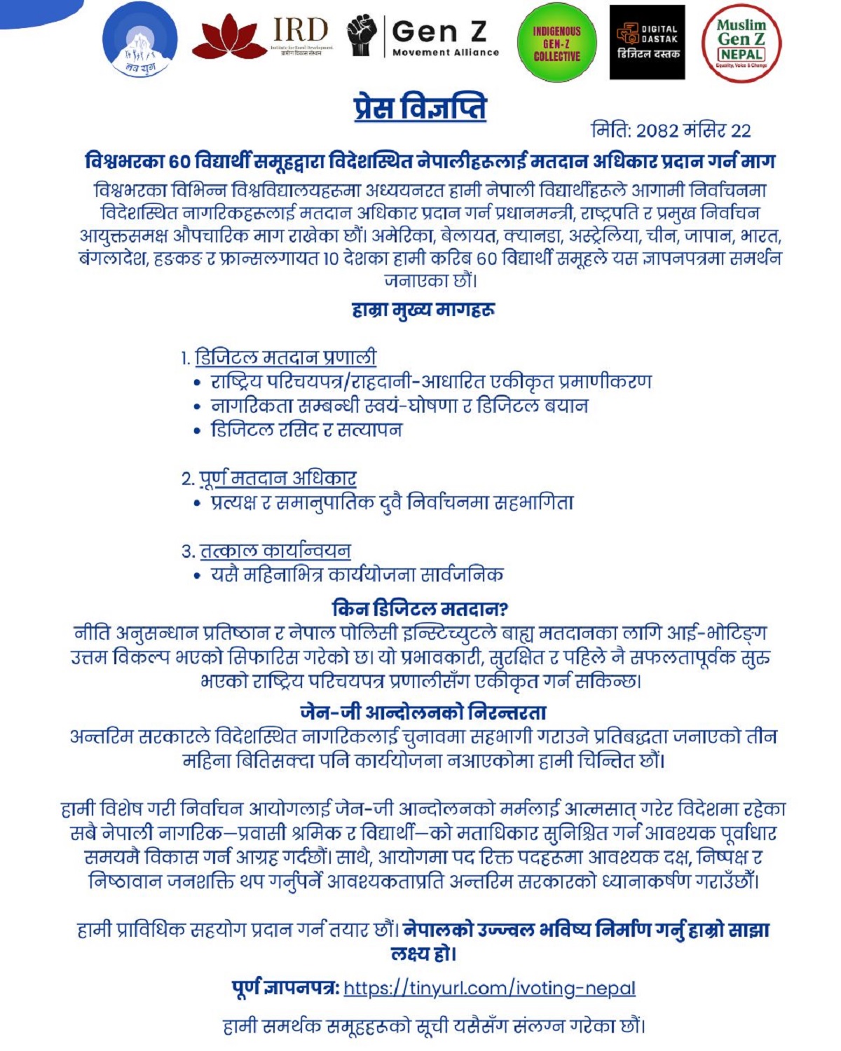 विद्यार्थी समूहले विदेशमा रहेका नेपाली—विशेषगरी प्रवासी श्रमिक र विद्यार्थीलाई निर्वाचन प्रक्रियामा सहभागी गराउन तत्काल कदम चाल्न आग्रह गरेका छन् ।