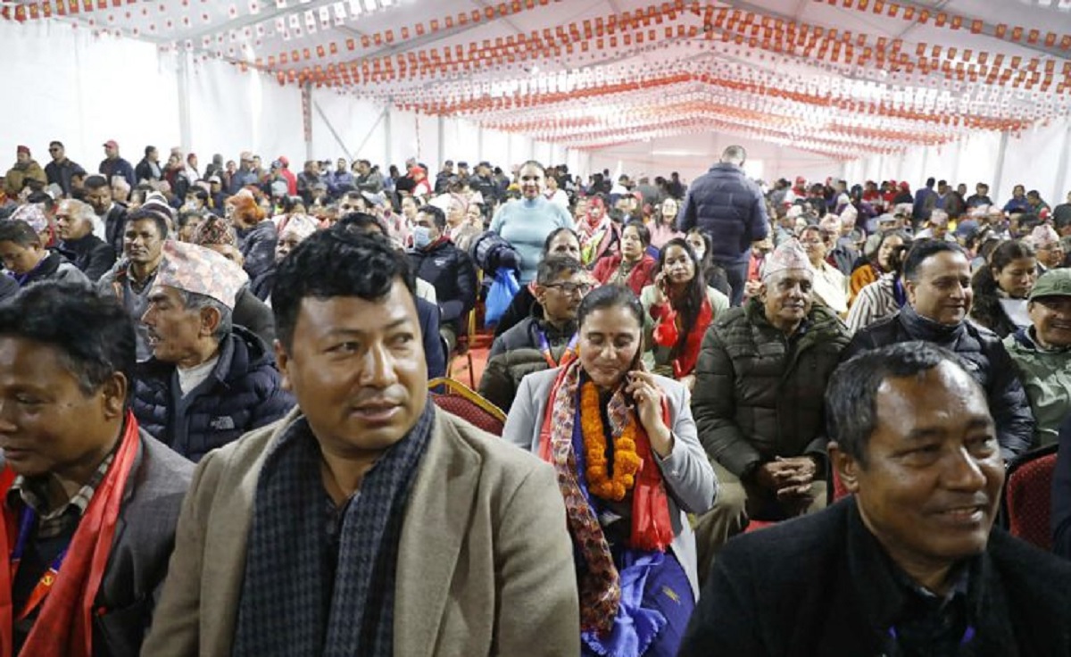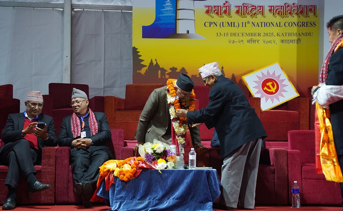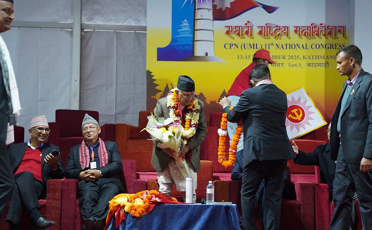 शपथ अघि महाधिवेशन आयोजनास्थल भृकुटीमण्डपले अहिले ओलीसहित निर्वाचित पदाधिकारीलाई नेता, कार्यकर्ताले माला तथा खादा लगाएर बधाई दिइरहेका छन् ।
